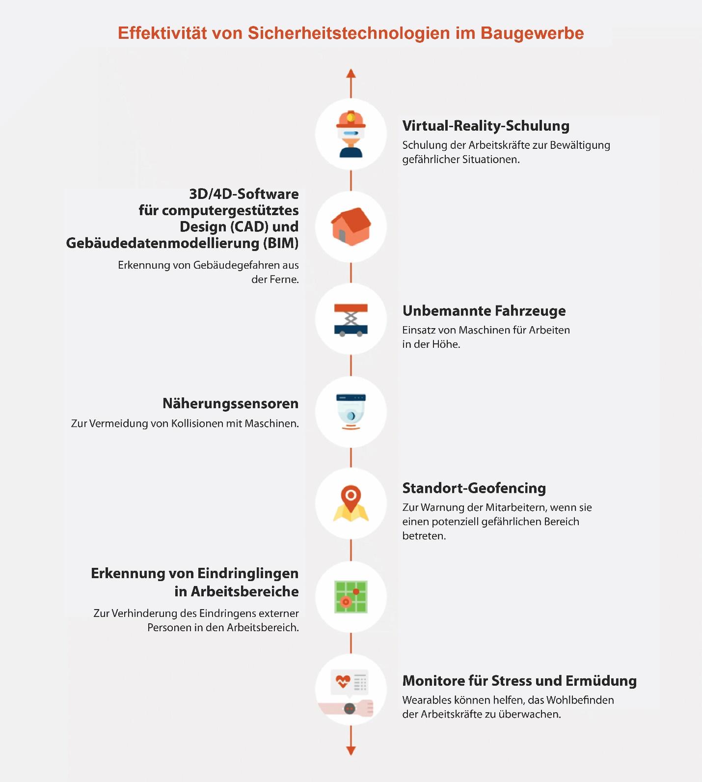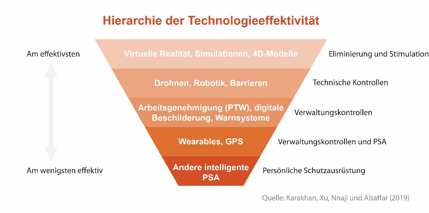 Es gibt jedoch zahlreiche Möglichkeiten mehr, die Sicherheit am Arbeitsplatz zu erhöhen. Eine davon ist die Einführung neuer Technologien. Die Untersuchungen von Karakhan, Xu, Nnaji und Alsaffar (2018) legen nahe, dass eine schnellere Einführung von Technologien das Sicherheitsniveau bedeutend erhöhen kann. Die offensichtlichste technologische Lösung besteht im Einsatz von Robotern und anderen automatisierten Systemen, um zu vermeiden, dass Arbeitskräfte gefährliche Tätigkeiten selbst ausführen müssen. Die Möglichkeiten gehen jedoch noch weiter und umfassen auch Schulungen in virtueller Realität sowie tragbare Technologien zur Überwachung der Gesundheit von Arbeitskräften, wie intelligente Helme, Sensoren und Uhren.