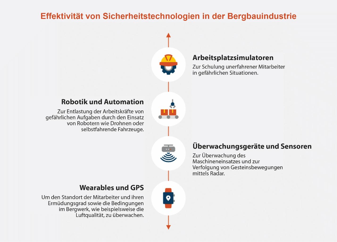 Durch Robotik und Automatisierung, beispielsweise in Form von selbstfahrenden Lastwagen oder Roboterbohrern, können Mitarbeiter gefährliche Situationen und Umgebungen vermeiden. Drohnen können Fotos in einsturzgefährdeten Bergwerken aufnehmen und arbeitsintensive Vermessungs-, Inspektions- oder Kartierungsarbeiten ersetzen.