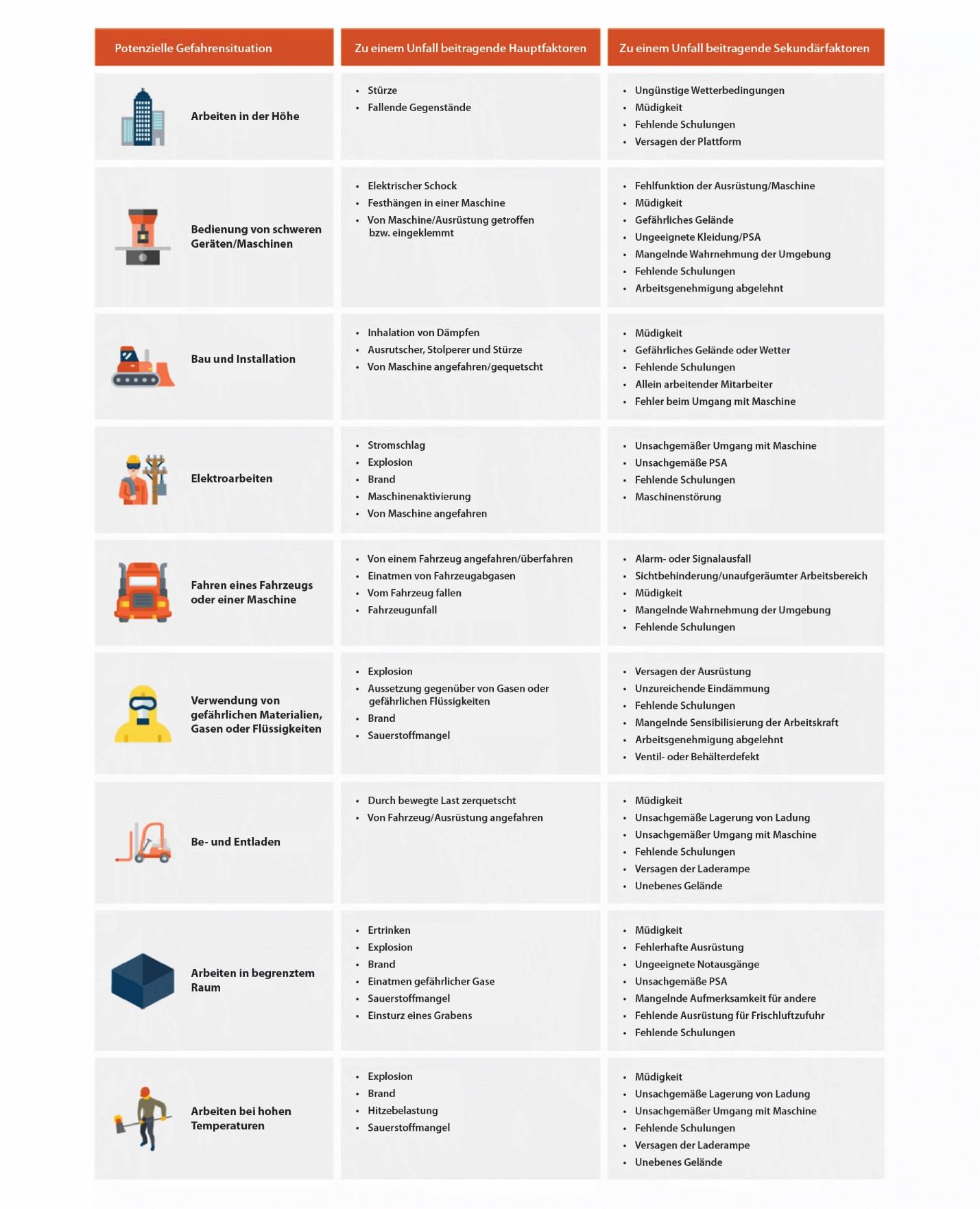 Wie im NSC-Bericht haben wir zudem die Risikofaktoren für jede Gefahrensituation als primär oder sekundär eingestuft. Das Ereignis selbst stellt häufig den unmittelbaren Auslöser für akute Gefahren dar, etwa bei einem Sturz während Arbeiten in der Höhe.