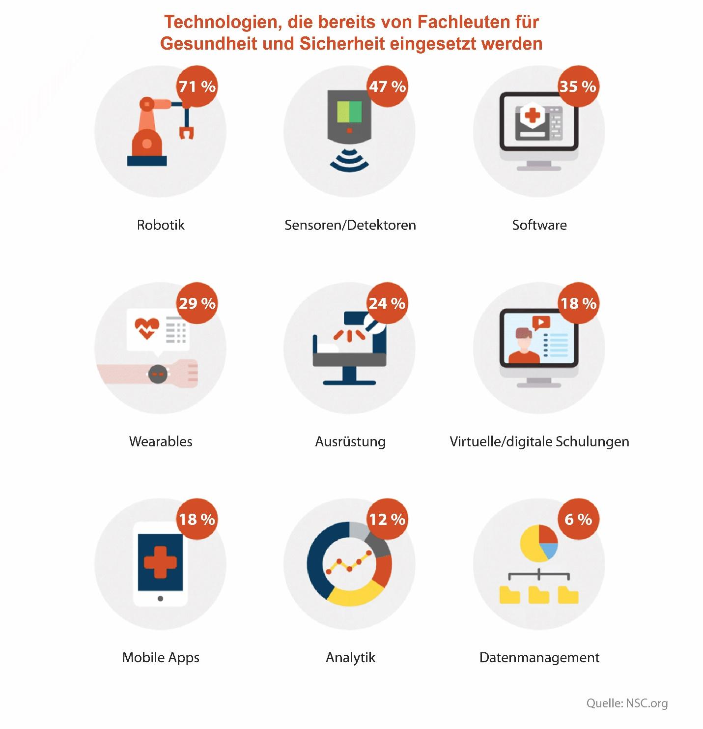 Durch Interviews und Umfragen mit EHS-Fachleuten zu Sicherheitstechnologien erhielten wir wertvolle Einblicke darin, welche Technologien sie bereits einsetzen oder künftig verstärkt nutzen möchten. Die vom NSC befragten Fachleute nannten eine umfangreiche Liste von Technologien, die sie bereits nutzen:
