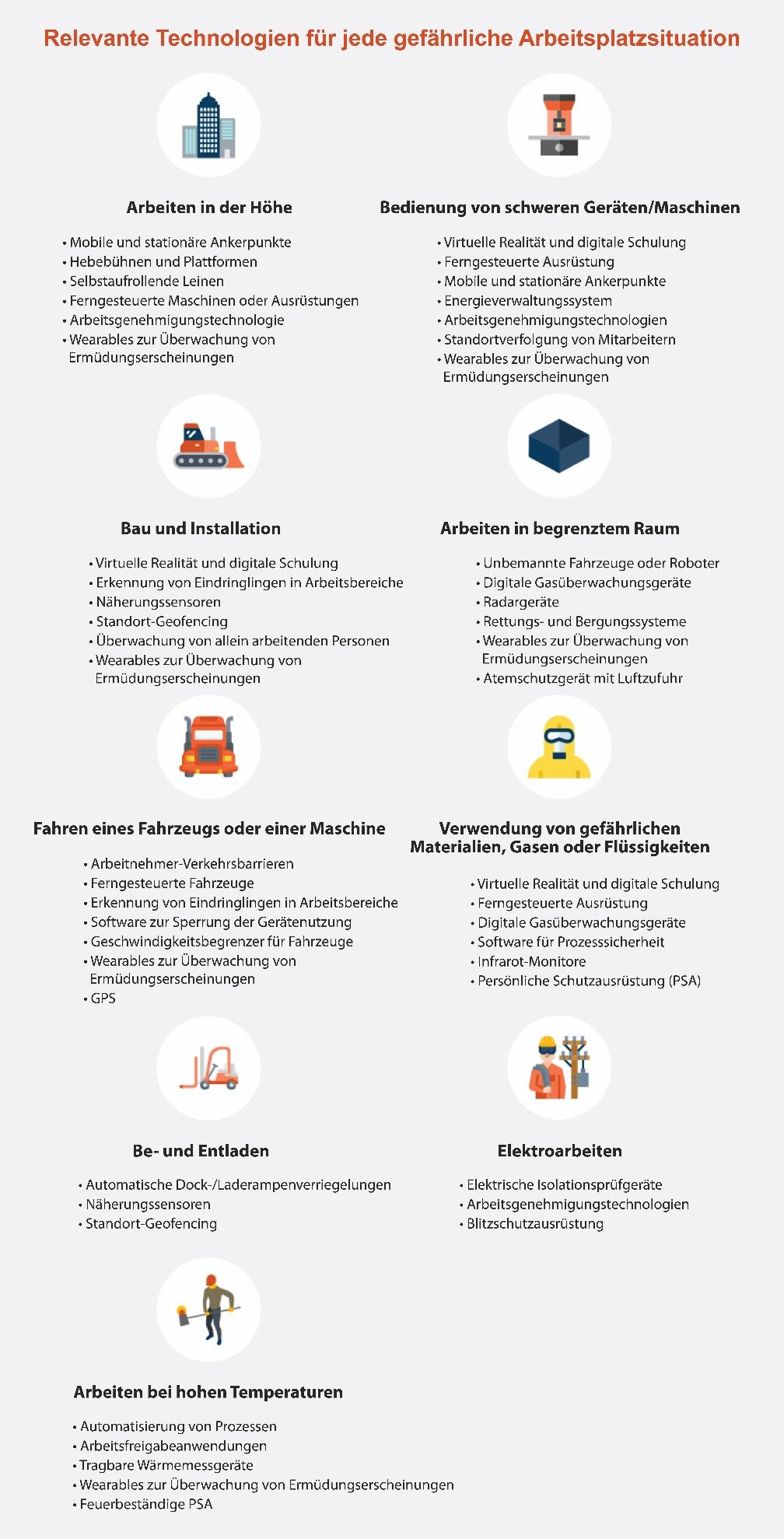 Basierend auf dem NSC-Bericht sowie ergänzenden Studien und Fachartikeln zu den in der Fertigung, im Bauwesen, im Transportwesen, im Bergbau sowie in der Öl- und Gasindustrie eingesetzten Technologien haben wir die folgende Visualisierung erstellt. Sie zeigt Technologien auf, die in typischen Gefahrensituationen besonders relevant sind.