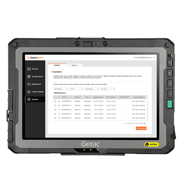 With ZX10-EX, IT administrators can save time through batch configuration of device and system settings across your deployment, including those for battery-charging, display, navigation, scanning, the quick settings panel, date and time, app update, and its four programmable buttons, via OEMConfig or Getac’s optional proprietary deployXpress Cloud software.