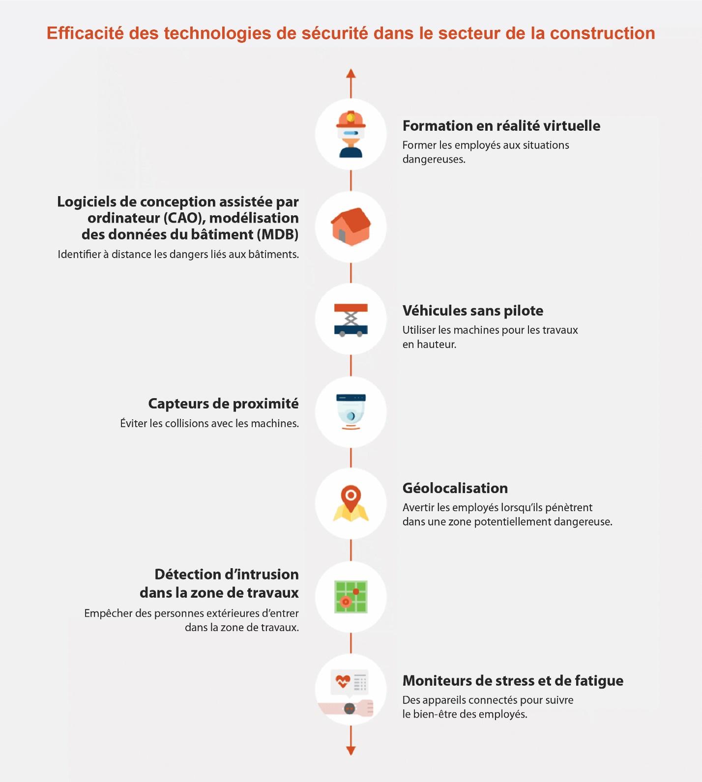 Selon des études et des recherches récentes, il existe une marge d’amélioration considérable en matière de technologie de sécurité dans le secteur de la construction. Cette opportunité existe du fait que le secteur de la construction est généralement en retard par rapport aux autres secteurs en matière d’adoption des technologies. Toutefois, le secteur peut tirer parti de différentes technologies de multiples façons, comme le montre le graphique ci-dessous.