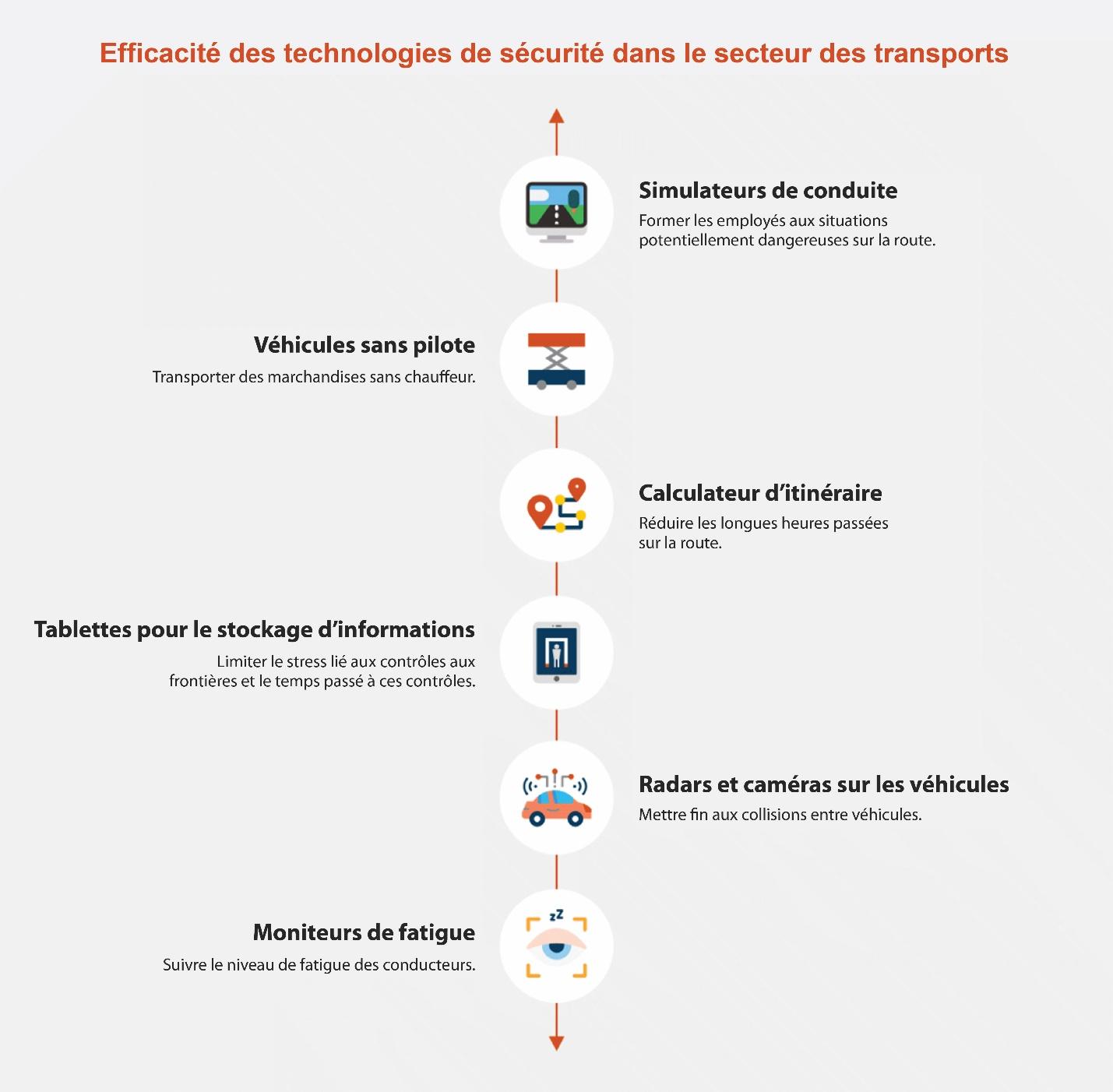 Les technologies de sécurité les plus utilisées dans le secteur des transports sont les capteurs, les caméras et les dispositifs de surveillance des obstacles et de la vitesse.