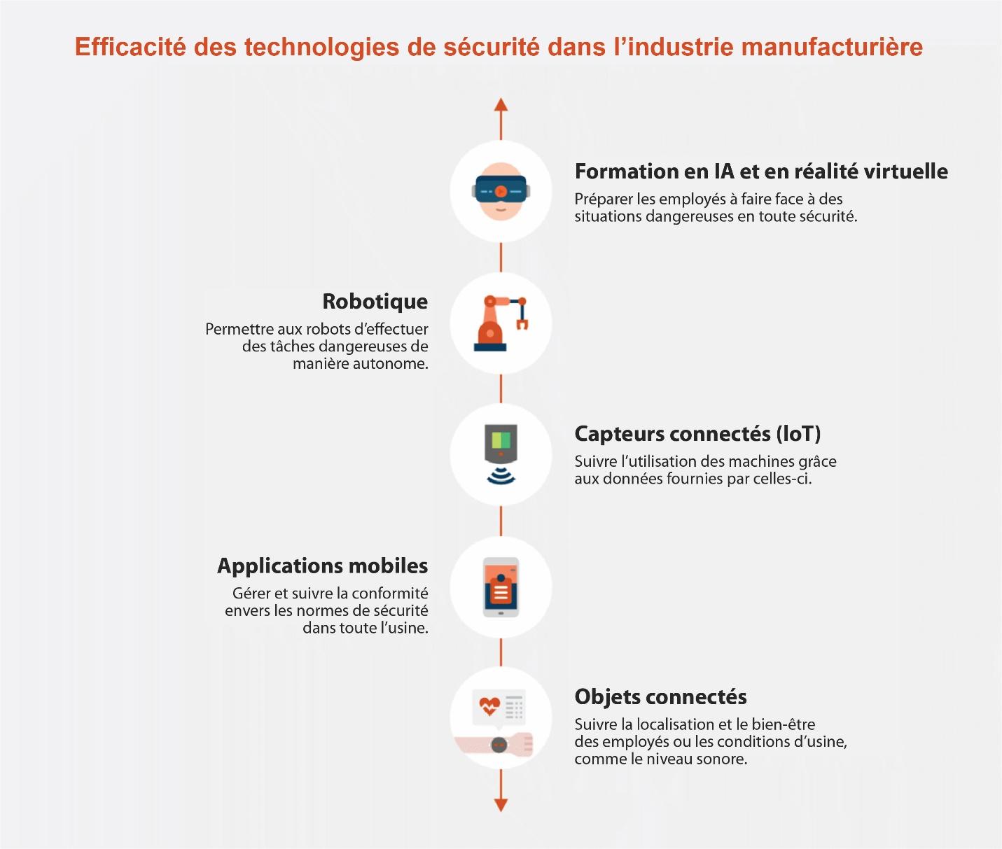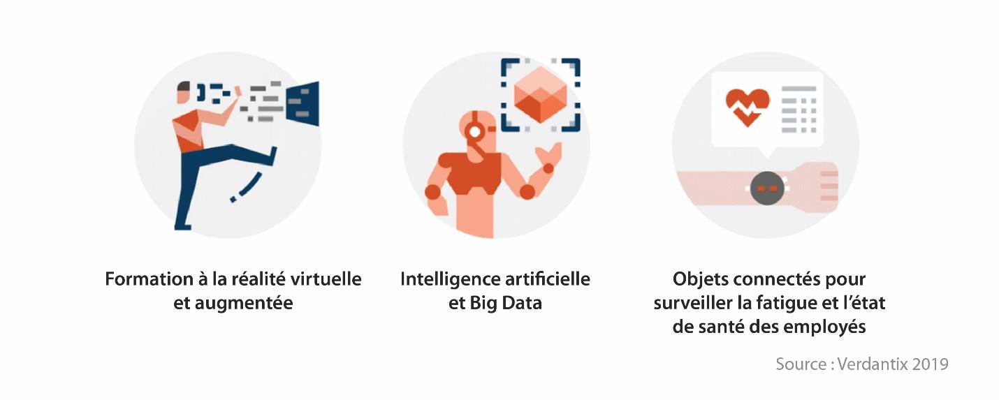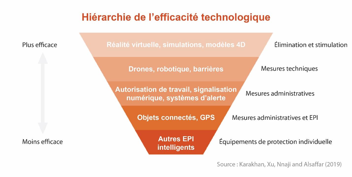 Toutefois, il existe de nombreux moyens d’améliorer la sécurité sur le lieu de travail. L’un de ces moyens consiste à adopter les nouvelles technologies. Selon les recherches menées par Karakhan, Xu, Nnaji et Alsaffar (2018), des taux plus élevés d’implémentation technologique peuvent améliorer les niveaux de sécurité. La solution technologique la plus évidente consiste à utiliser la robotique et d’autres équipements automatisés pour éviter que les employés n’effectuent des tâches dangereuses. Mais les options vont bien au-delà de cela : il existe par exemple la formation en réalité virtuelle ou des objets connectés permettant de surveiller la santé des employés, tels que les casques intelligents, les capteurs et les montres.