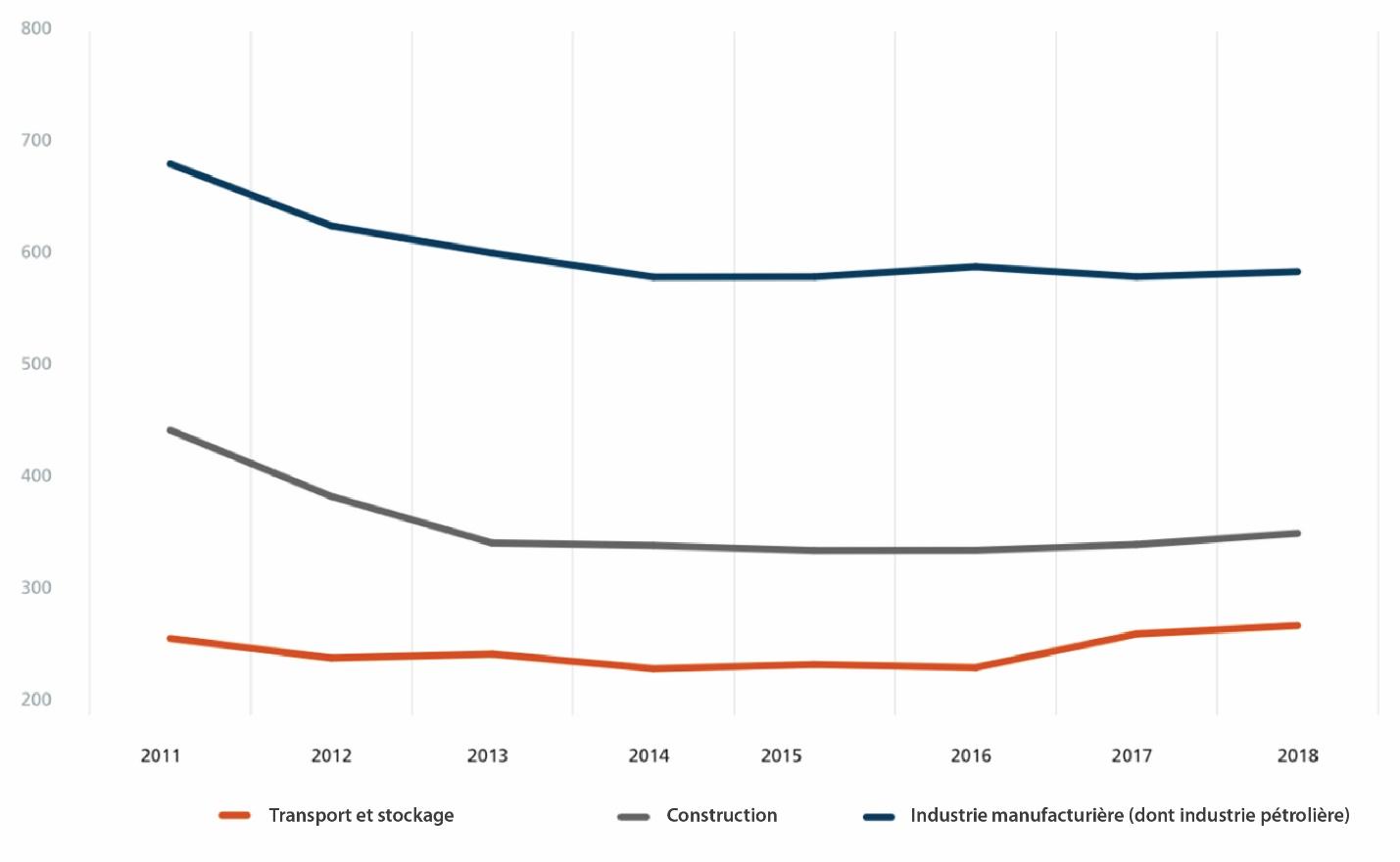 Nous avons également examiné l’évolution du nombre de blessures signalées dans ces industries au cours des dernières années.