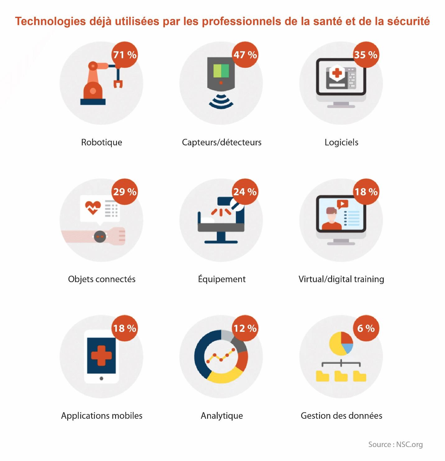 En examinant les interviews et les enquêtes menées auprès des professionnels de l’environnement, de la santé et de la sécurité sur les technologies de sécurité, nous avons pu nous faire une idée des technologies que les professionnels eux-mêmes utilisent déjà ou qu’ils souhaiteraient utiliser plus fréquemment. Les professionnels interrogés par le NSC ont mentionné une longue liste de technologies qu’ils utilisent déjà :