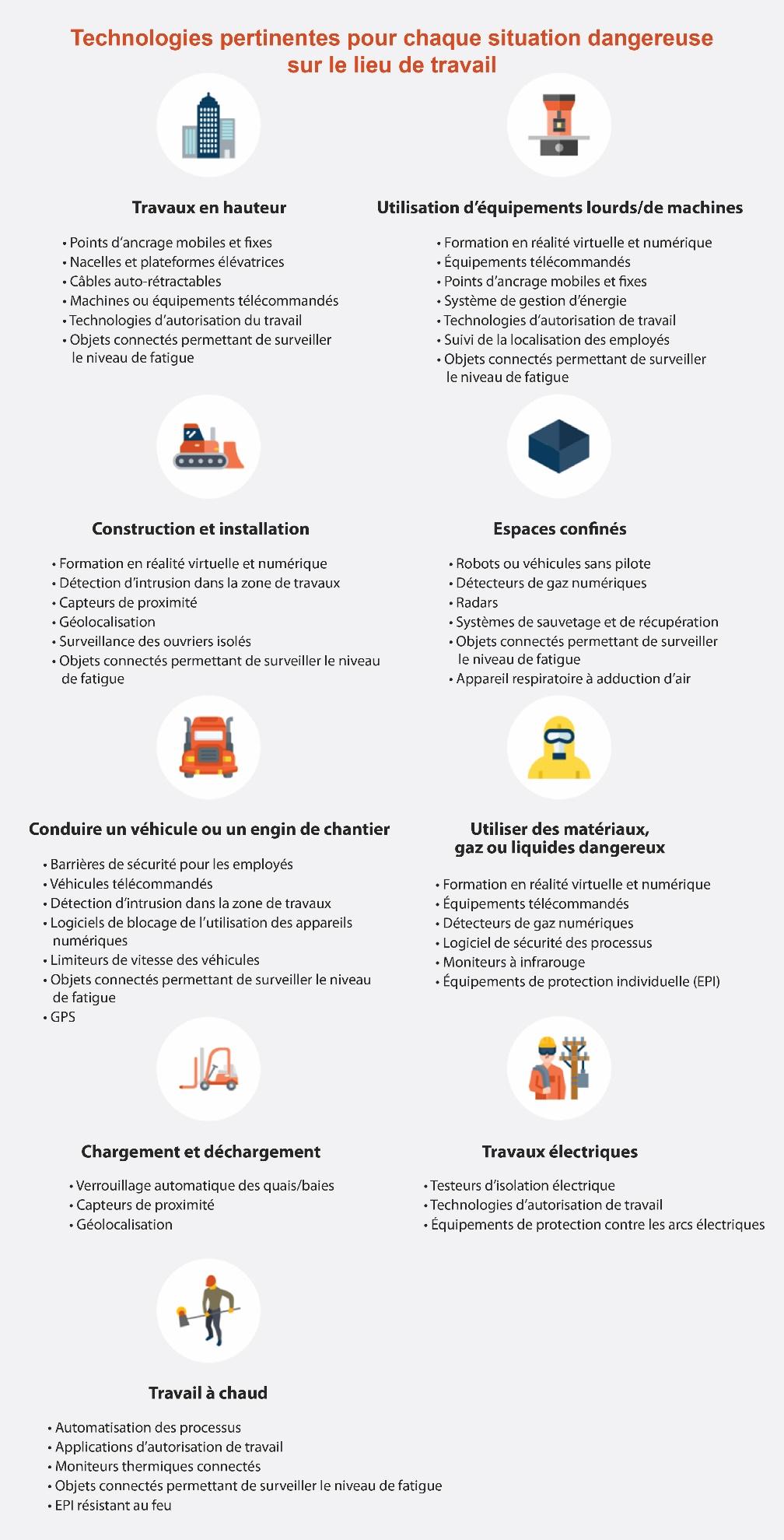 Sur la base du cadre défini dans le rapport du NSC et d’autres études et articles sur les technologies utilisées dans l’industrie manufacturière, la construction, les transports, l’exploitation minière et l’industrie pétrolière et gazière, nous avons créé la visualisation suivante des technologies pertinentes pour les situations dangereuses les plus courantes.